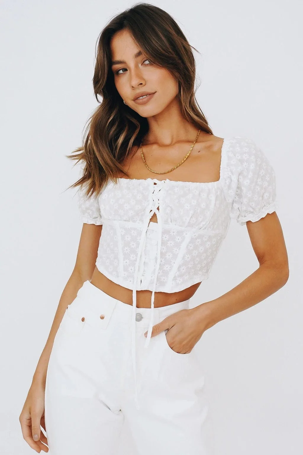 The Emes Shop top is detailed with a square neckline lace up string tying center bust. and puff capped sleeves. Features button front waist. and an elastic shirred back. Pair thismilkmaid-styled peasant top with your favorite pair of denim jeans and loafers for an effortless look.