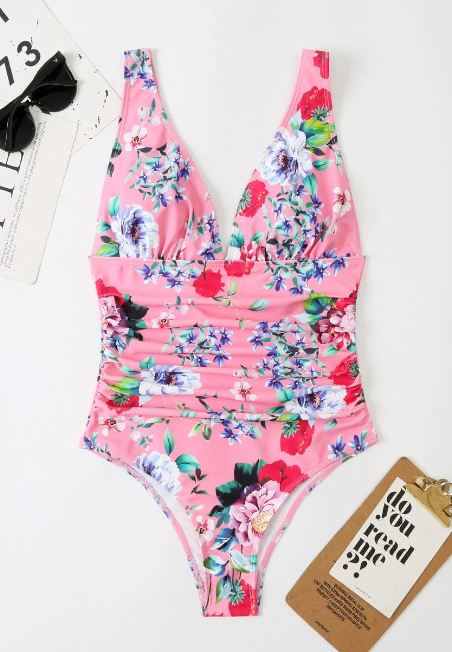 The Emes Shop one piece swimsuit details a deep V ineckline and a ruched center for a defined waist. Features summery and colorful floral designs all throughout.