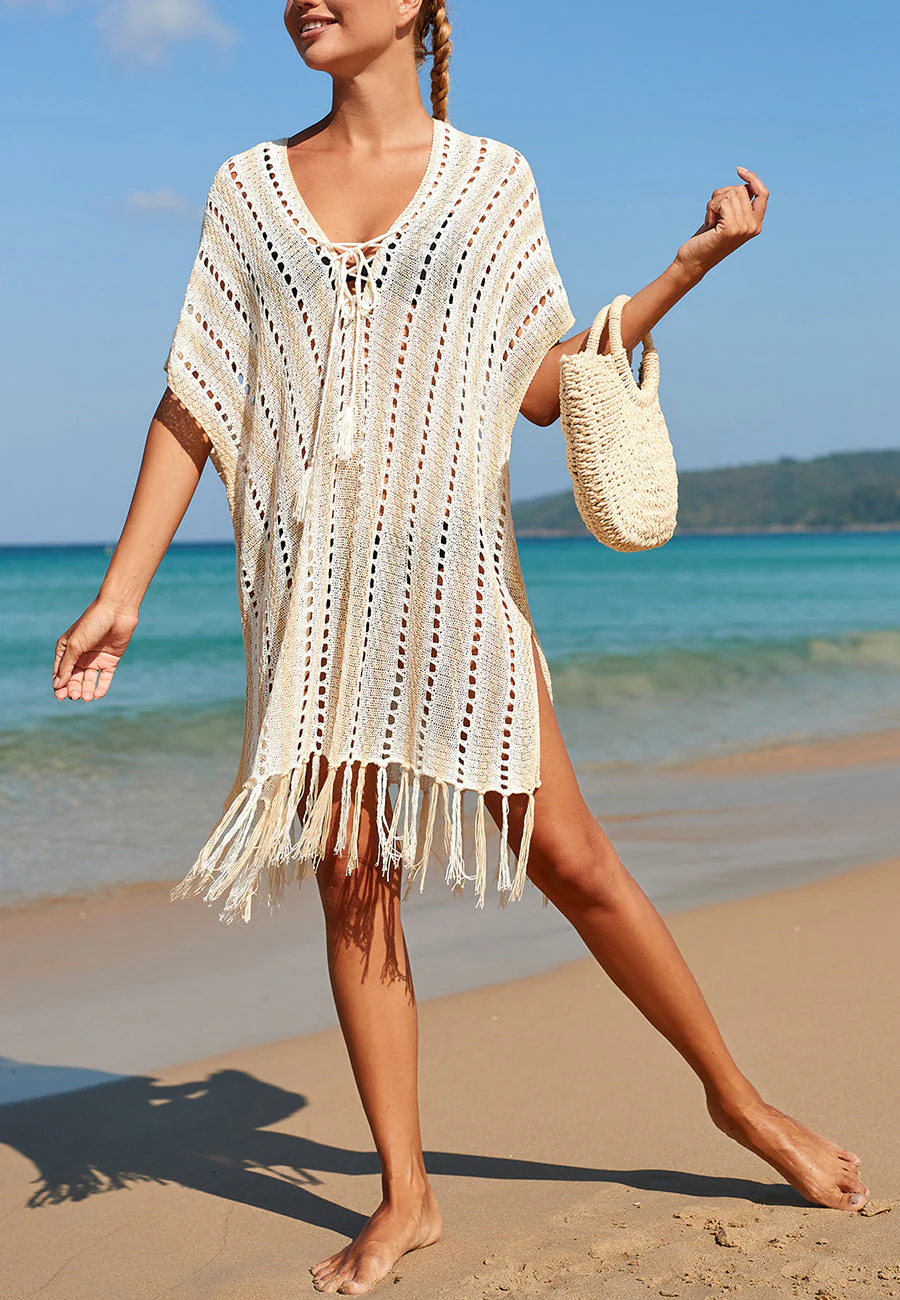 The Emes Shop cover-up dress is detailed with a lace-up v ineckline. and tassel hem trim. Features a sheer loose knit fabric. short sleeves. and falls above the knees. This cover-up dress is perfect to throw on after a long day at the beach. Finish off the look with a wide-brimmed hat and your favorite pair of sunnies.