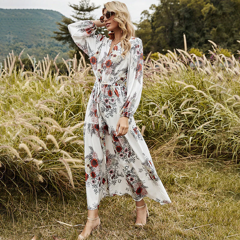 Summer is here and it's time for a cute casual everyday dress! The Emes Shop long sleeve maxi dress is detailed with floral patterns across the white soft poly fabric. Features a v neck line. long sleeves. ankle length. and front slit leg design for ease of movement. The dress is incredibly soft and breathable for the summer time. Pair it with your favorite heels for a semi formal look.