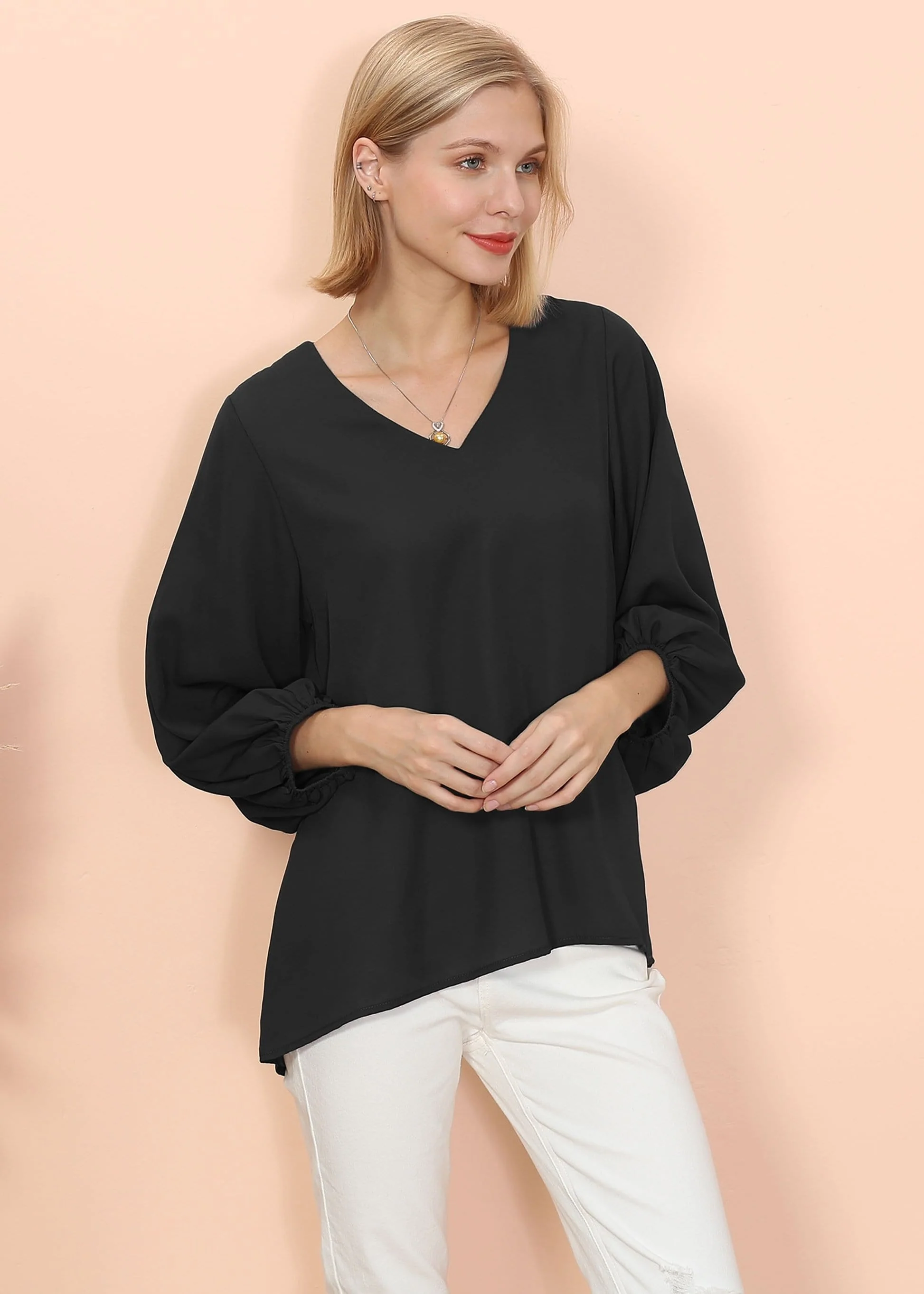 The Emes Shop long sleeve is detailed with incredibly cute flaring lantern sleeves that give the look its unique design style. Features a deep v neck line. loose relaxed fit. and ruffle wrinkle details along the long sleeve. Pair it with your favorite jeans for an easy look.