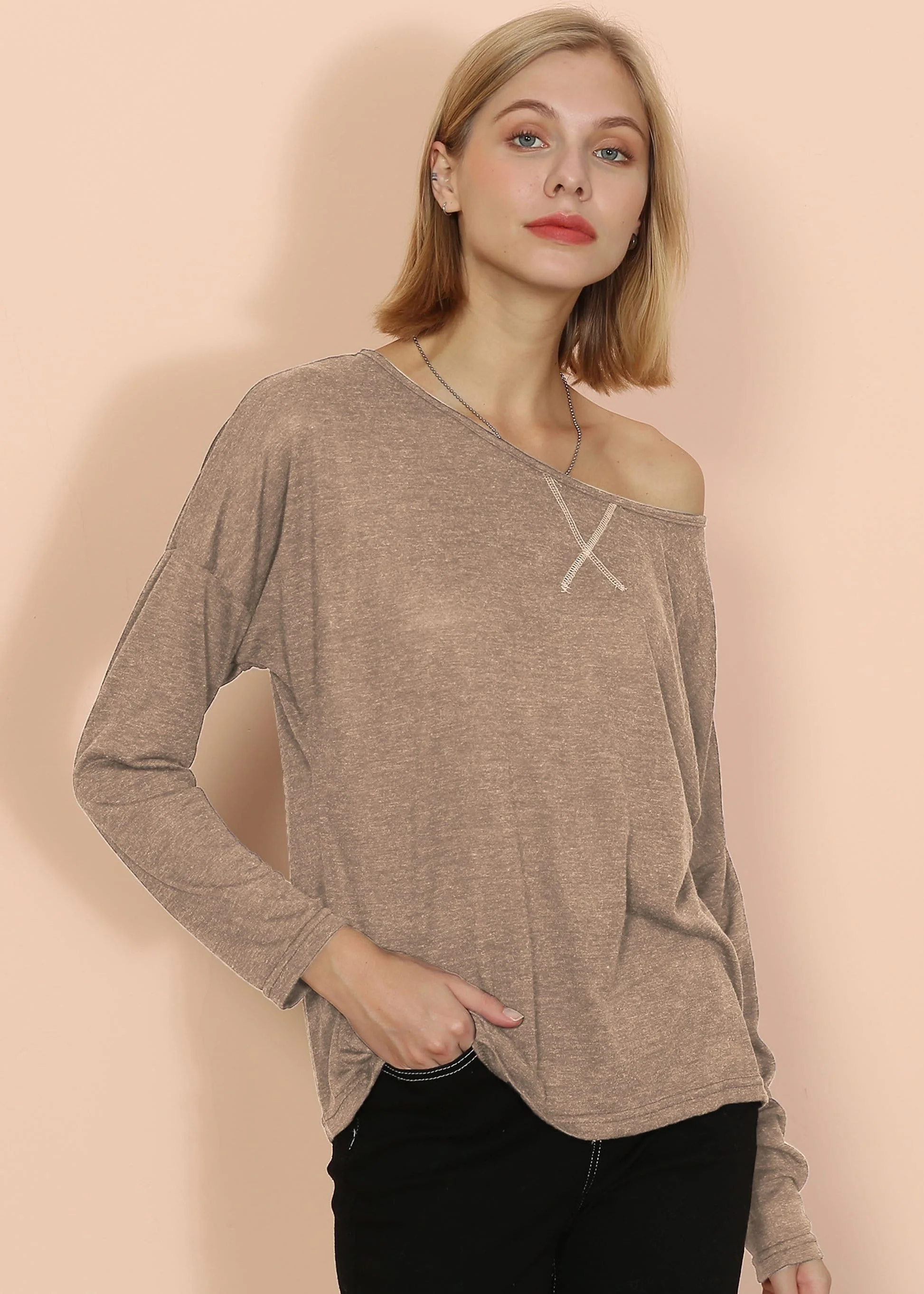 The Emes Shop long sleeve top is detailed with a cute wide boatneck that lets you wear it as is over your shoulders or off one shoulder. Features long sleeves. a cross x stitching at the middle. and a relaxed silhouette.Wear it alone with your jeans or pair it with a comfy cardigan for a fall & winter time look.