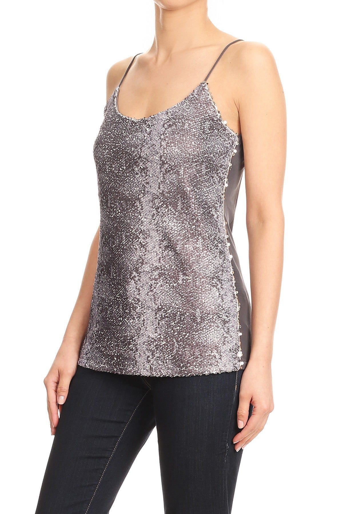 - SEXY SCOOP NECK SPAGHETTI STRAP STYLE. This sleeveless top is comfortable and lightweight. featuring spaghetti straps. flattering scoop neck line. all over round sequins on the front and semi sheer lightweight fabric at back. The fabric is stretchy for a form fitting flattering look.