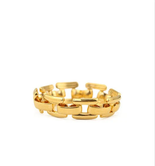 The Emes Shop ring details two unique designs. both featuring small gold chain links. One highlights slightly bigger. brick-like chains while the other has small interlocked chains.