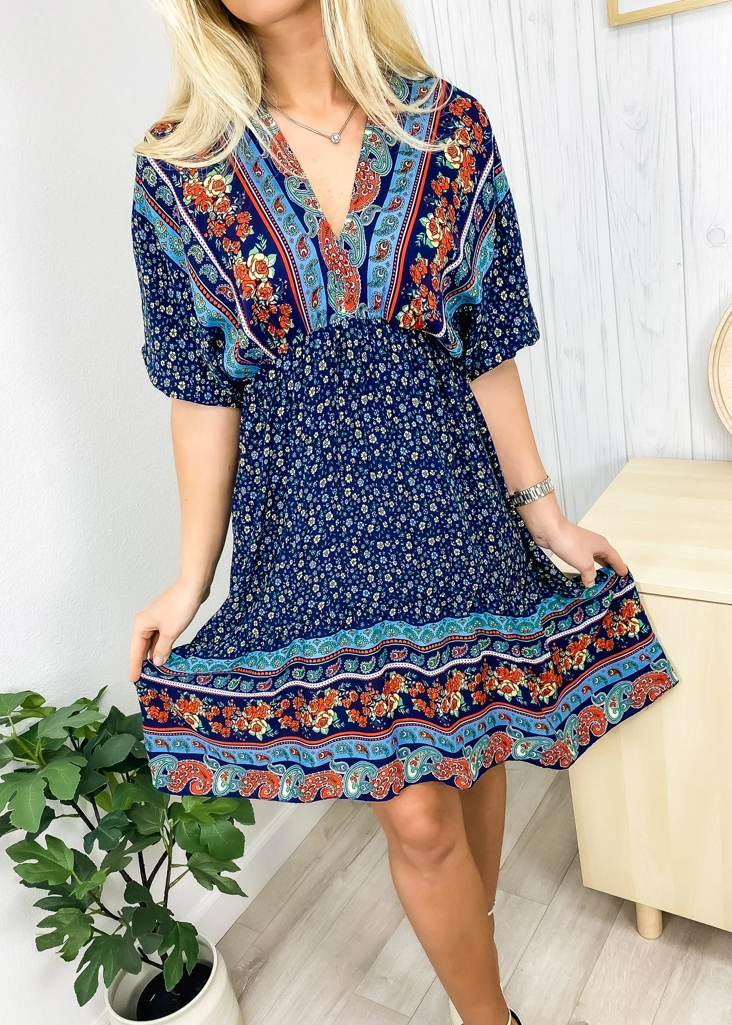 The Emes Shop dress is detailed with gorgeous mixed prints of paisleys and floral prints. Features a v neck line. elbow-length sleeves. asymmetrical hem. and knee length. Pair it with a straw bag and sunnies for a boho summer look.