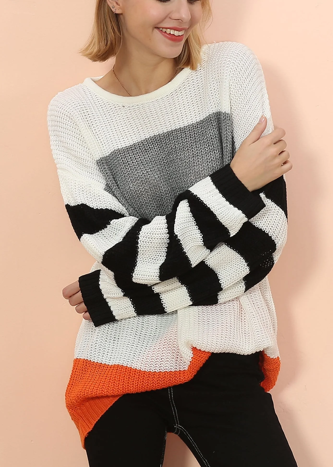 The Emes Shop sweater is detailed with fun mixed striped patterns that play with color blocking elements. Features a round neck line. drop shoulder. long sleeves. and an oversized fit. Pair it with jeans and sneakers for a casually cool look.
