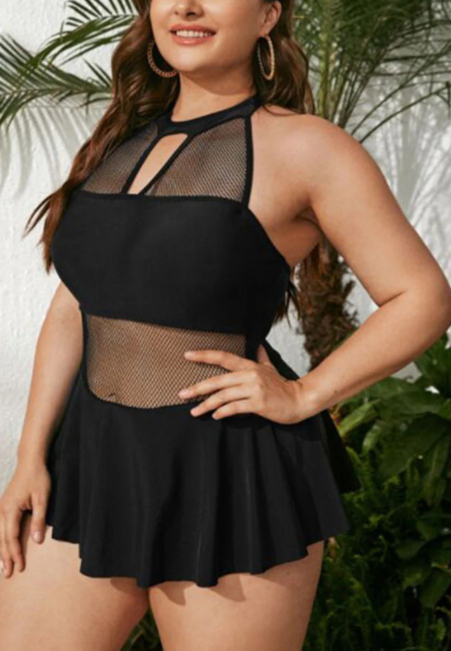 Plus High Halter Mesh Paneled Ruffled Skirt One-Piece