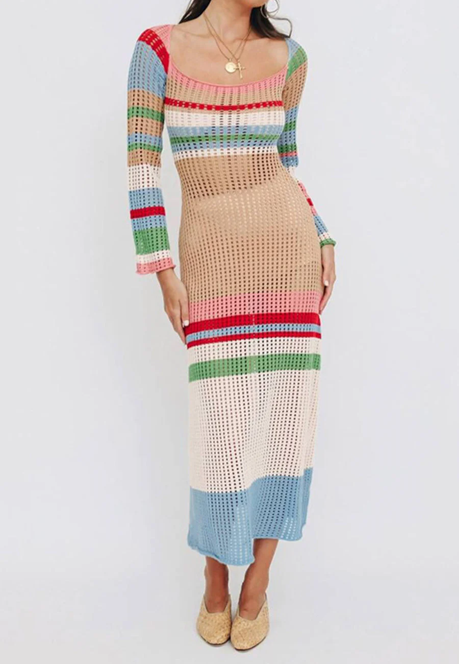 Rainbow Striped Square Neck Long Sleeved Cover-Up Dress
